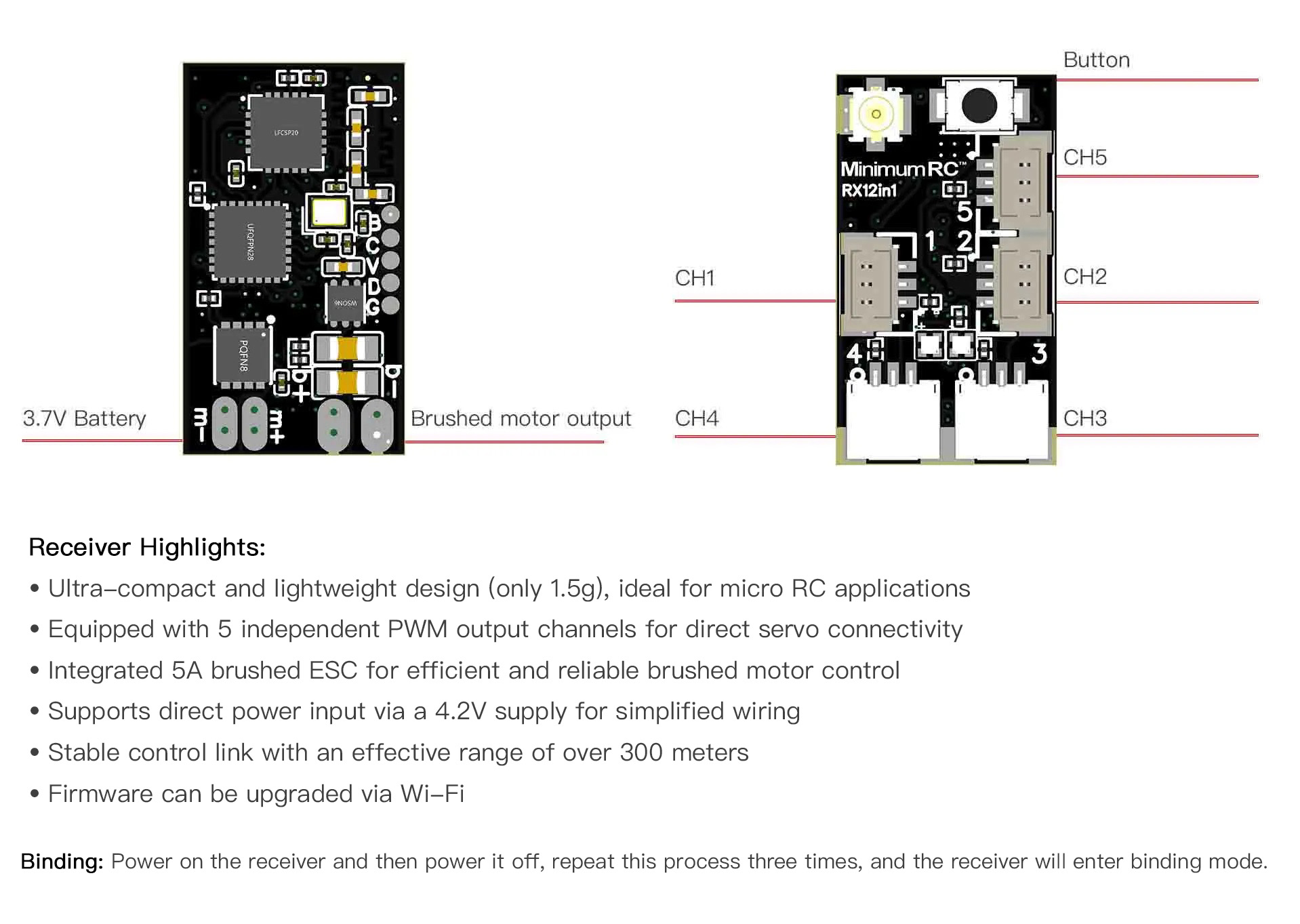 Binding: Power on the receiver and then power it off, repeat this process three times, and the receiver will enter binding mode.